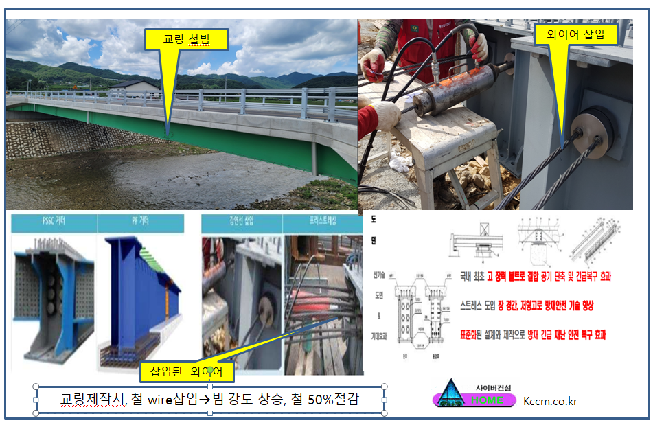 상기 그림에서 보는 바와 같이 교량 철빔을 제작할 때 철 wire를 내부에 삽입해 인장 강도를 올리면