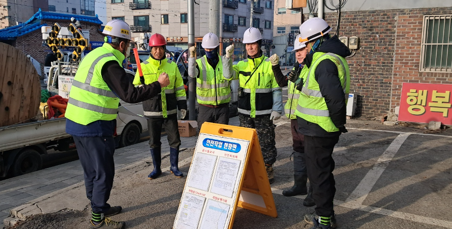 위의 사진은 현장에서 작업 전 오늘의 작업 에 대한 내용을 설명 하고 (TBM 실시 )