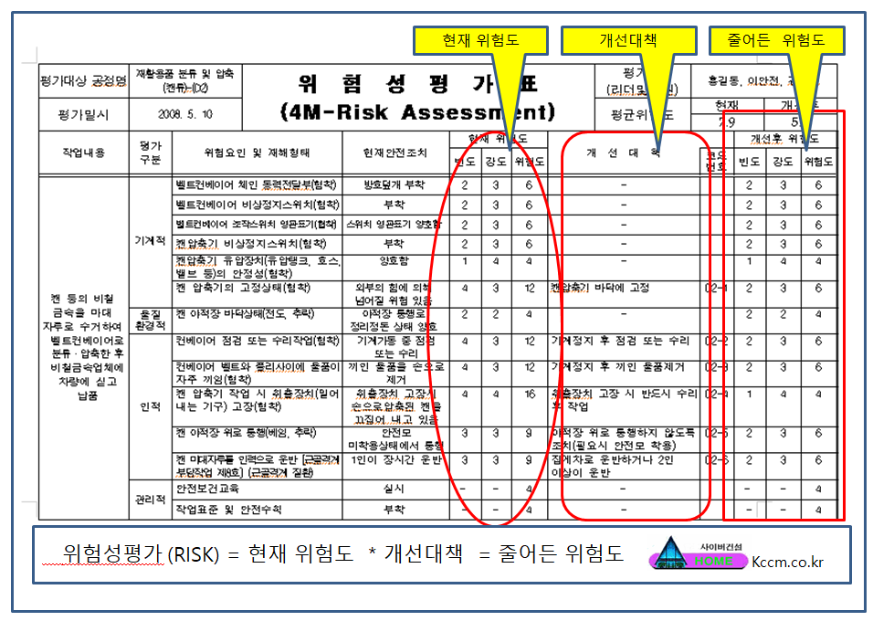 현재 위험도 (빈도, 강도, 위험도) , 개선 대책, 개선 후 위험도를 반드시 표기해야 하는데