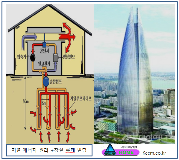 우리나라의 수도 서울 잠실 롯데월드 바닥에는 바닥에서 200m 심도로 약 700여 개의 지열 에너지 관을 심어