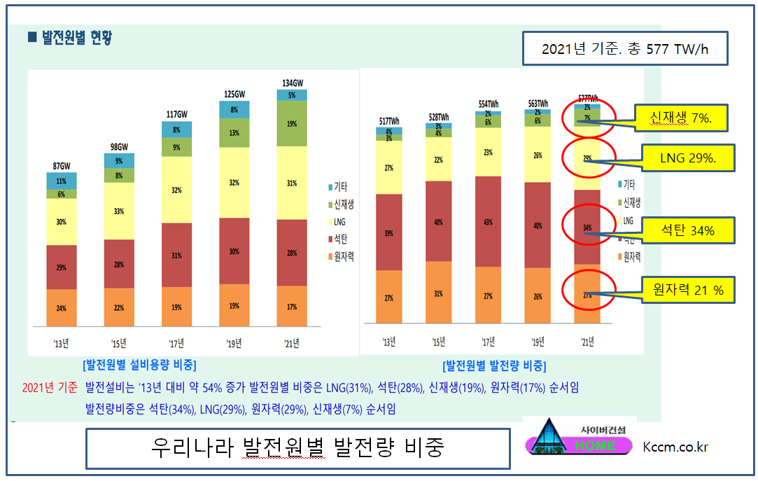 발전 원별로 구분해 본다면 원자력 발전이 약 21%, 석탄 발전이 34%, LNG발전이 29%,