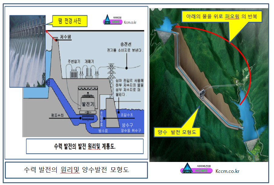 위의 그림은 수력 발전 의 원리와 양수 발전의 모형도의 그림이다.
